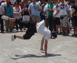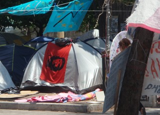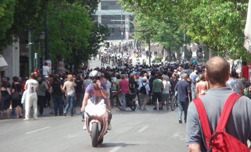 Nidbilder på grekiska politiker med snara om halsen. Che Guevara i svart mot röd bakgrund. I marmortrappan dansar ett gäng killar streetdance. Och de gör det bra. Idag förvandlades torget till en krigsskådeplats. När vi närmar oss möter vi ungdomar, men även äldre, med munskydd och vit skyddskräm i ansiktet. En del har mer avancerade gasmasker runt halsen och simglasögon. Några är beväpnade med långa påkar; alla av exakt samma modell. Det finns uppenbarligen en marknad. Man är beredda. Så tågar kravallpolisen in mot torget och formerar sig. Vita hjälmar, gasmasker, gröna uniformer. De möts av visslingar och höjda nävar. Temperaturen stiger. Från gatustånd kan man köpa visselpipor och halsdukar i Greklands färger – som inför en fotbollsmatch. En del drar runt vagnar och säljer vattenflaskor. När folk samlas finns också affärer att göra. Så kommer smällarna från tårgasgranaterna och den vita röken stiger. Visselpipor och trummor ljuder. Soptunnor brinner. Stenar och yoghurtburkar (är man i Grekland så är man) flyger. Omgrupperingar. Innanför poliskedjorna den hårdföra kärnan. Närmast utanför de som hejar men inte själva vill strida. Så en lucka. Och så vi nyfikna. Samtidigt pågår ett vardagsliv: mopeder, taxibilar, turister med resväskor. Något kvarter bort sitter man på tavernor och dricker Mythos och frappé och äter gyros och grekisk sallad. Dagen innan har en kypare sagt oss att han inte läser tidningen men att det visst skall tas ett mycket viktigt beslut i parlamentet nästa vecka. Det stämmer nog att han inte läser nyheterna; det är denna vecka som beslutet skall tas. Det är därför de offentliganställda strejkar idag och i morgon. Nå, tunnelbanan går. Folk måste ju kunna ta sig in till centrum för de stora planerade demonstrationerna (som inte skall förväxlas med kravallerna). Men även om vår kypare inte var, eller ville vara, välunderrättad, tillade han dystert: ”We have to pay for many years …” Frågan är om han menade att man nu måste betala för många år av ekonomisk vanskötsel – eller att han nu såg framför sig många år av ekonomiska uppoffringar. Kanske både och.