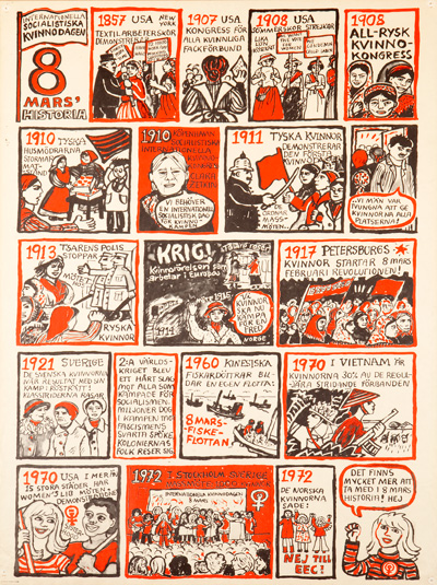 Annette Fahlsten var inte främmande för att använda sig av den gängse vänsterrekvisitan som till exempel röda fanor och stjärnor. Men hennes affisch domineras av blommor. Hon höll sig till blomtemat, hennes vanliga motiv. Odlade blommor och ogräs. Bildytan ramades in av dekorativa bårder. Ingenting gavs djupverkan. Färgerna är inte tonade eller fördrivna. I mitten syns en stor amaryllis vars blomblad ändå liknar en mjuk röd stjärna. Runt om finns andra blommor och blad. I sidobårderna är det korslagda veteax. På ett ställe står en liten kaktus som känns en aning främmande. Framställningen har en naiv, grovhuggen och vänlig ton. Kanske mer flower power än proletariatets diktatur. Så här beskriver Annette Fahlsten själv arbetet med affischen: ”Affischen trycktes i screentryck, inte offset. Jag gjorde färgseparering för hand och skar ut 3 färger i ljustäckande film. Den röda, gula och blå färgen. Den gröna bildades av övertryck av gult på blått.” Den blev en stor succé, en långkörare som trycktes upp i många upplagor. Idag är den en av de mest kända bilderna från epoken.