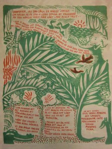 Men så gick jag ifrån idén med att ha en bild av Marie med. Det var hon som valt sångerna. Då skulle hennes bild av samhället komma fram. Den försökte jag tolka. Så kom den till; BONADEN av den svenska vildmarken. Humor, styrka, stad, land, nutid, dåtid, jorden grön och revolutionen röd. På något sätt hade jag funnit en gammal kvinnlig bildform som ändå blev ny. Det blev Maries bild och inte en bild av Marie.”