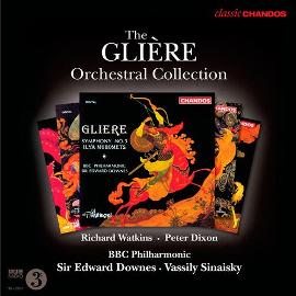 Reinhold Glière: Orchestral Collection: Symphonies Nos. 1–3, The Zaporozhy Cossacks, Suite from The Red Poppy, Suite from The Bronze Horseman, Concerto for Horn and Orchestra, Gyulsara, Consert Waltz, Shakh-Senem, Ballad, Overture on Slavonic Themes, Heroic March for the Buryiat-Mongolian ASSR, Holiday at Ferghana (Chandos/Naxos). Box med 5 cd. Speltid: 78’08 + 64’09 + 60’40 + 70’16 + 75’30.