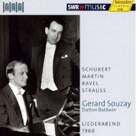 Recension, Skivor söndag, juli 29th, 2012Gérard Souzay & Dalton Baldwin: Liederabend 1960 (Franz Schubert: ”Der Zwerg”, Blumenlied”, ”Seligkeit”, ”An die Musik”; Frank Martin: Sexhs Monologe aus ’Jederman,”; Maurice Ravel: ”Cinq mélodies populaires grecques”, ”Deux mélodies hébraiques”; Richard Strauss: ”Heimkehr”, ”Ständchen”, ”Ruhe, meine Seele”, ”Zueignung”). (Hänssler Classic/Naxos). Speltid: 56’18.