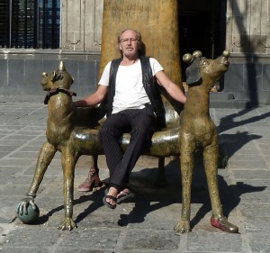 De uppnosiga hundarna med lustiga huvudbonader och försedda med skor verkar bekanta. Jag har sett dem tidigare på bild, men jag har inte kunnat utröna vem konstnären är. Ryggstödet är omkring tre meter högt och krönes av ett likaledes uppnosigt hundhuvud försett med en krage. Denna bänk eller hundtron står  på plaza Santo Domingo, som efter Zocalo, det stora torget – är det historiskt sett mest betydelsefulla torget i Mexico City.