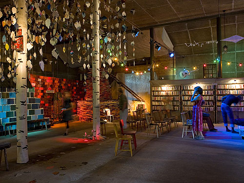Förutom att det är ett stort och ganska välsorterat (ja, sorterat och sorterat) antikvariat, så är det som ett slags allkonstverk. I en i sig fantastisk gammal hyttmiljö har böcker använts för att bygga skulpturer och rum som är mycket spännande att röra sig i. Till och med scenen där olika uppträdanden sker varje helg, är byggd av böcker.