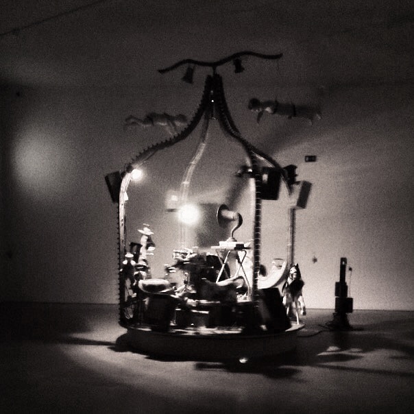 spelas klassisk musik, och någon röst som säger något då och då. Jag har svårt att urskilja vad rösten säger. Ljussättningen är liksom i karusellen också hela tiden i en ständig förändring och bidrar till den obehagliga stämningen. För ett ögonblick vänder sig en av robotarmarna rakt mot mig, som sitter på en bänk på tryggt avstånd, och jag rycker till och får för mig att den verkligen ser mig med sitt lysande öga. Kanske har jag läst för mycket science fiction, men för första gången i mitt liv upplever jag en verklig skräck för att maskinen verkligen ska spåra ur och skada mig. Det känns som om konstverket är farligt på riktigt. Jag frågar mig själv hur mycket man ska våga lita på en maskin. Men när föreställningen är över går jag genast fram och trycker på knappen igen.