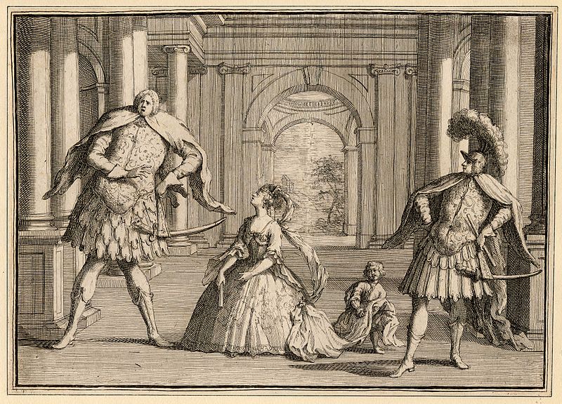 Senesino (till vänster) på en gravyr från 1700-talet. Den speciella, och här karikerade, kroppskonstitutionen var karaktäristisk för kastraterna.