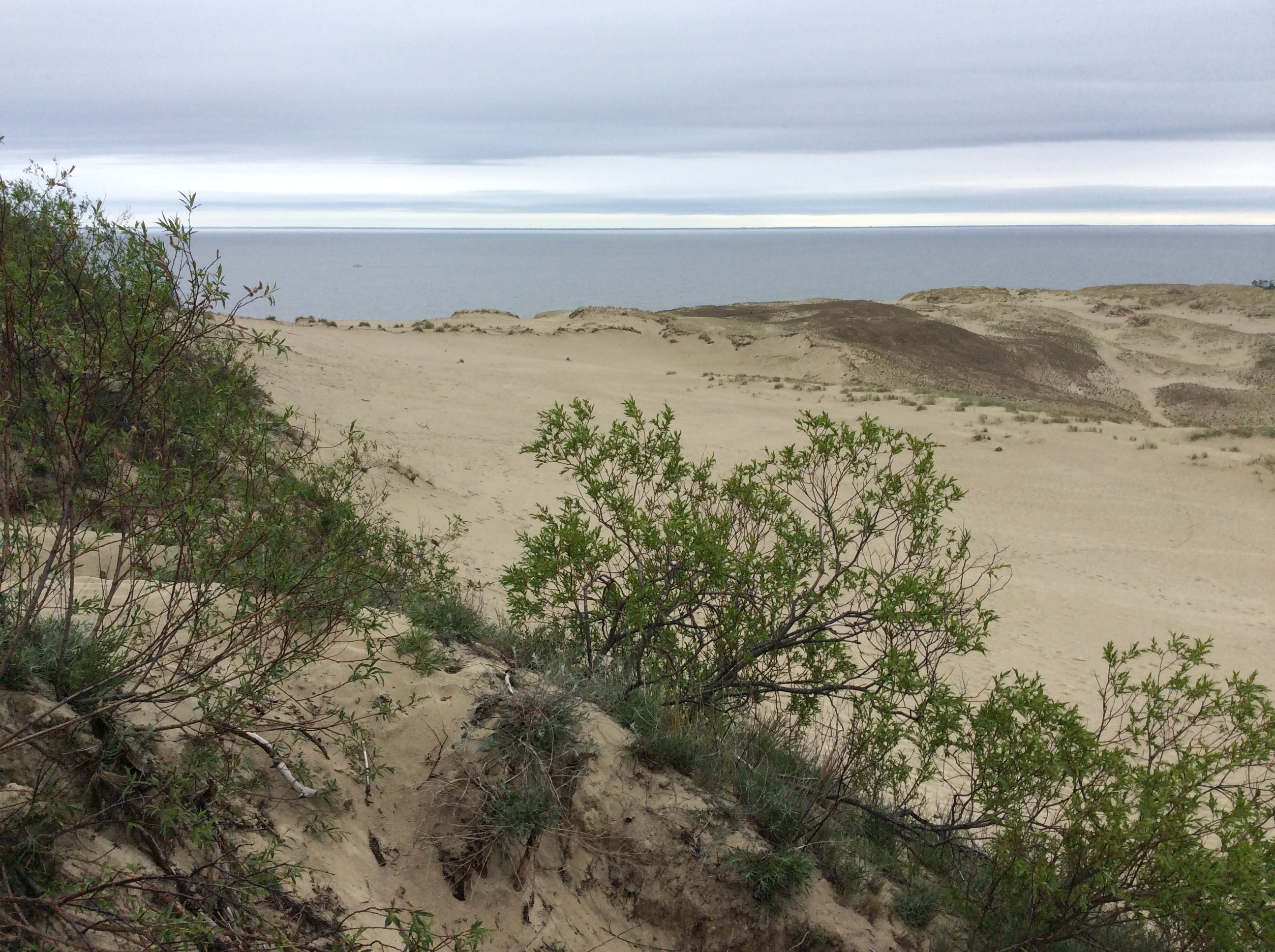 Utanför den lilla staden Nida, som delvis är en pittoresk fiskeby, delvis präglas av byggnader från den sovjetiska staden (stadshuset ser verkligen ut som en arkitektonisk maktmanifestation), bjuds fantastiska panoraman från en höjd som förr var hednisk offerplats. Härifrån ser man också långt in i Ryssland: gränsen till den ryska enklaven Kaliningrad går bara några kilometer bort. Den höga kullen är ett välbesökt turistmål och många kringboende passar på att sälja bärnsten – som finns i rik mängd i vattnen häromkring. (Senare såg jag några män stå med håvar och fiska upp bärnsten från en pir ut i vattnet.)