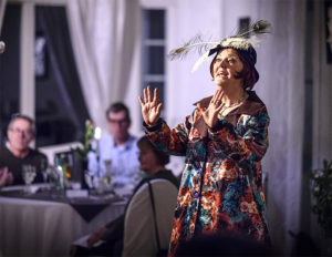 Det är välspelat av ensemblen. Det märks inga premiärnerver. Kanske är det rutinen från de tidigare deckargåtorna som ger lugn. De fyra aktörerna har alla två roller att gestalta. Lena Söderbergs två motpoler, den glättiga skulptrisen Anna-Britta Aldén med stockholmsaccent samt den strikta och buttra stiftelsesekreteraren Gullborg Skiöld gör hon med den äran. Även David Levis hovmästare sticker ut, men samtliga rollgestaltningar sitter. Tilläggas ska att alla fyra skådespelare också hjälper till i servisen, bär fram mat och dryck och småpratar med gästerna. Också det en viktig del för helheten. Att uppleva både utsökt mat och skådespel är, som sagt, ett lyckat koncept.