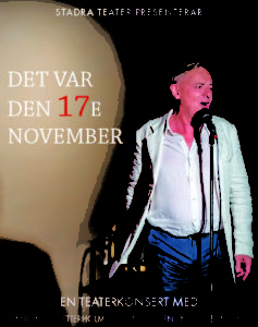 Nu är ju Magnus Wetterholm inte bara teaterdirektör utan också skådespelare, sångare och estradör. Och i dessa egenskaper kan man se honom på Nora Teaterbiograf den 17 och 18 november i en föreställning kallad – ja, just det: Det var den 17 november. Förutom Wetterholm medverkar Johan Graden på piano och Niklas Sundén på dragspel, två musiker som också förknippas med Rikard Wolff. Det blir sånger som, meddelar Wetterholm, ”drabbar mig och som fyller mig med lycka, sånger som handlar om kärlek, vänskap, svartsjuka och drömmar”.