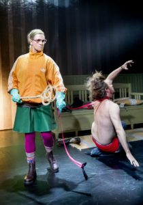 Kanske är det den glädje vi i publiken delar med skådespelarna att ÄNTLIGEN få leka teaterlekar igen, som gör att det känns extra roligt och härligt när ridån går upp för ”spring-i-dörrar-tragedin”, som teatern själv vill kalla det hela. Birger sitter redan fjättrad i Giselas trånga jordkällare. Gisela tar ut sin hämnd för den maktutövning hon anser att regissören Birger utövat mot henne. Gisela är längst ner på teaterns maktpinnar och Birger är högst upp, en av dessa ”genialiska” regissörer som fått andra att dansa efter sin pipa utan att ifrågasättas. Nu hade han gått för långt. han hade använt den tystlåtna och fjära sufflösen för att hårdhänt demonstrera en slagsmålsscen. Själva övergreppet var alltså inte av sexuell karaktär, men likt Stieg Larssons Lisbeth Salander tar Gisela en gruvlig hämnd.