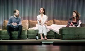 Nyskrivet. Realistiskt och avskalat. En lång, grå soffa och tre personer.